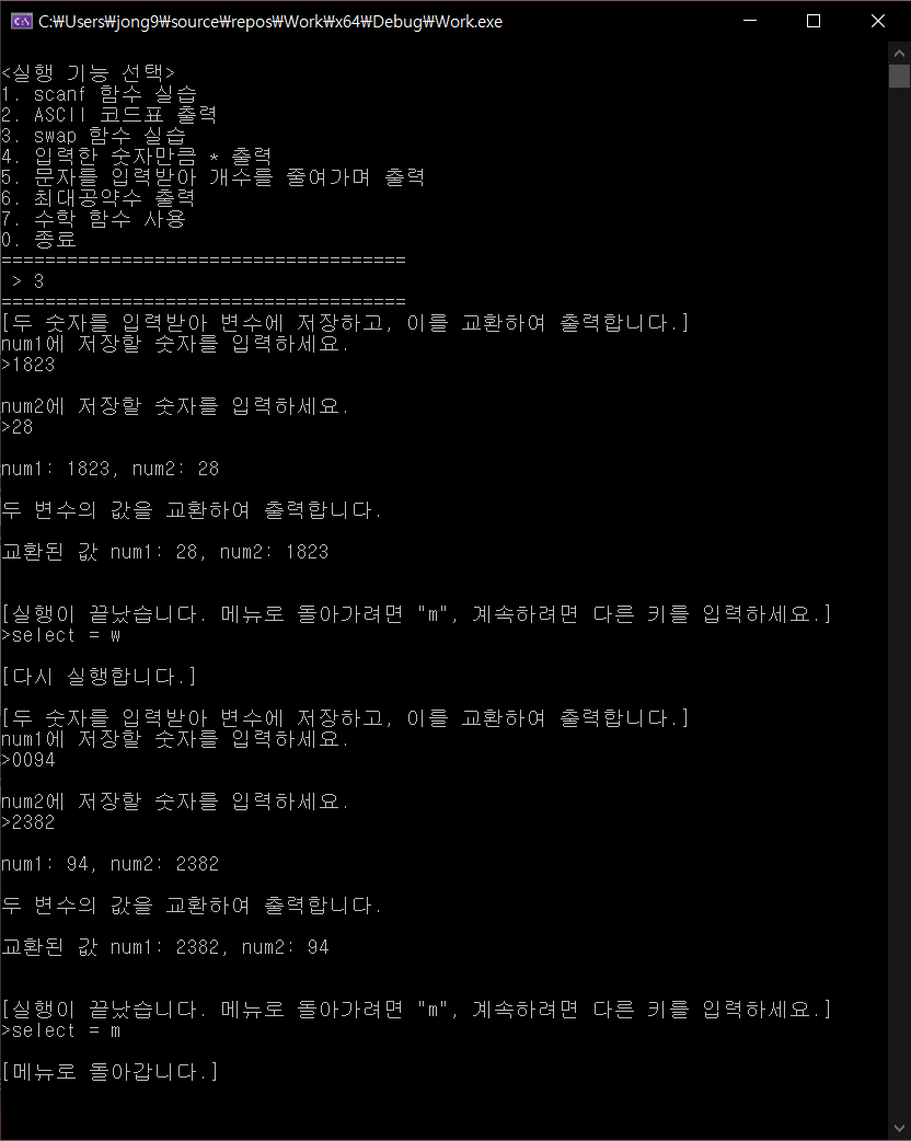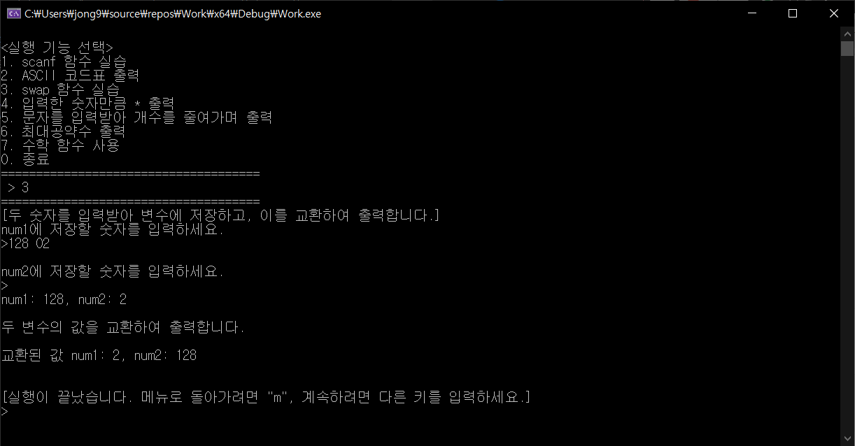 void work03() { while (1) { char buf[100]; int* pbuf; int num1; int num2; printf("[두 숫자를 입력받아 변수에 저장하고, 이를 교환하여 출력합니다.]\n"); printf("num1에 저장할 숫자를 입력하세요.\n>"); scanf("%d", &num1); //printf("num1의 주소값은 %08x\n", &num1); printf("\nnum2에 저장할 숫자를 입력하세요.\n>"); scanf("%d", &num2); printf("\nnum1: %d, num2: %d\n\n", num1, num2); printf("두 변수의 값을 교환하여 출력합니다.\n\n"); //printf("num2의 주소값은 %08x \n", &num2); int* a = &num1; int* b = &num2; //printf("a의 주소값은 %08x\n", a); //printf("b의 주소값은 %08x\n", b); swap(a, b); //printf("a의 주소값은 %08x\n", a); //printf("b의 주소값은 %08x\n", b); printf("교환된 값 num1: %d, num2: %d\n", *a, *b); if (cont() == 1) break; } } //사용자 정의 함수 void swap(int* a, int* b) { int* pBuf; int temp[500]; //printf("a 값 보기: %x\n", a); pBuf = temp; //printf("\n%x가 pBuf의 주소, %x가 a의 주소, %x가 b의 주소!!!\n\n", &pBuf, &a, &b); *pBuf = *b; //printf("pBuf의 주소 %08x, b의 주소 %08x, a의 주소 %08x\n", pBuf, b, a); //printf("pBuf의 값 %d, b의 값 %d\n", *pBuf, *b); *b = *a; //printf("pBuf의 주소 %08x, b의 주소 %08x, a의 주소 %08x\n", pBuf, b, a); *a = *pBuf; //printf("pBuf의 주소 %08x, b의 주소 %08x, a의 주소 %08x\n", pBuf, b, a); } - 실행 화면
