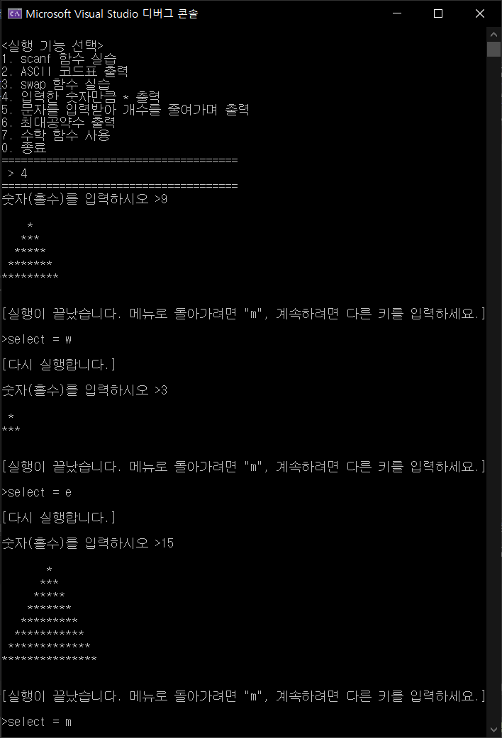 void work04() { while (1) { int n; printf("숫자(홀수)를 입력하시오 >"); scanf("%d", &n ); printf("\n"); for (int repeat = 0; repeat < (n - 1) / 2 + 1; repeat++) { for (int i = (n - 1) / 2 - repeat; i > 0; i--) { printf(" "); } for (int j = 1; j < (repeat+1) * 2; j++) { printf("*"); } printf("\n"); } if (cont() == 1) break; } } - 실행 화면