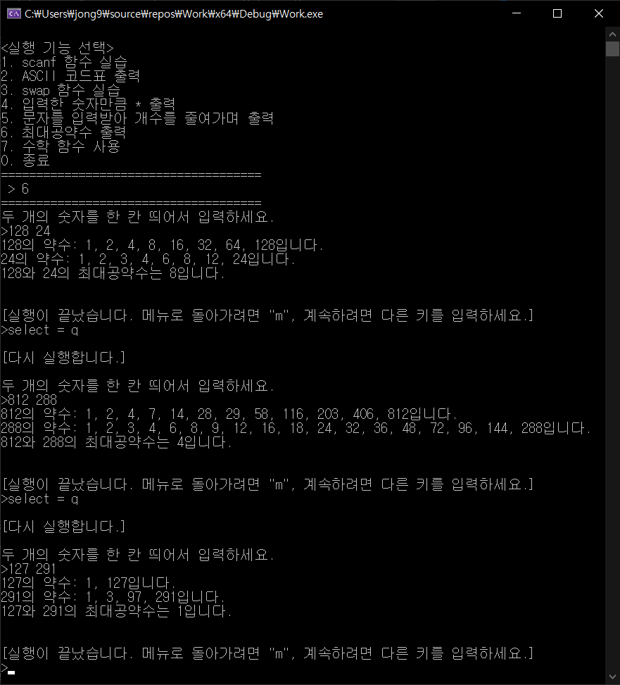 void work06() { while (1) { int num1; int num2; printf("두 개의 숫자를 한 칸 띄어서 입력하세요.\n>"); scanf("%d %d", &num1, &num2); //num1의 공약수 출력 Factors(num1); Factors(num2); //최대공약수 출력 printf("%d와 %d의 최대공약수는 %d입니다.\n", num1, num2, gcd(num1, num2)); if (cont() == 1) break; } } int Factors(int a) { int count = 0; printf("%d의 약수: ", a); for (int i = 1; i < a; i++) { if (a % i == 0) { printf("%d, ", i); count++; } } printf("%d입니다.\n", a); return count + 1; } int gcd(num1, num2) { int gcd; for (int i = 1; i <= num1 && i <= num2; ++i) { if (num1 % i == 0 && num2 % i == 0) gcd = i; } return gcd; } - 실행 화면