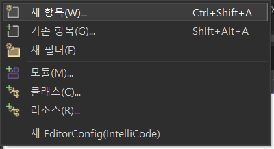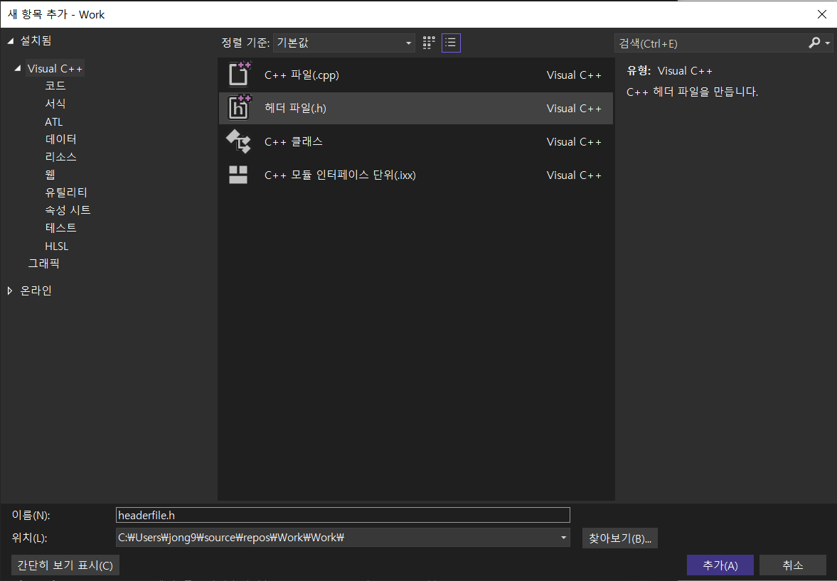 1. 헤더파일 생성을 위해 솔루션 탐색기의 헤더파일 우클릭 -> 추가 -> 새 항목 -> 헤더파일 선택