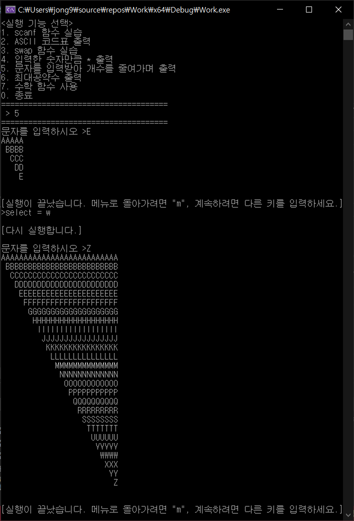 void work05() { while (1) { int character = 0; printf("문자를 입력하시오 >"); scanf(" %c", &character); int A = 65; for (int i = 64; i < character; i++) { for (int blank = 65; blank < A; blank++) { printf(" "); } for (int wr = A - 1; wr < character; wr++) { printf("%c", A); } printf("\n"); A++; } if (cont() == 1) break; } } - 실행 화면