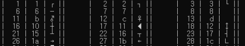 void work02() { while (1) { printf(" Dec Hx Char\n"); for (int i = 1; i < 128; i++) { printf("[%4d] [%4X] %4c ", i, i, i); if ((i) % 3 == 0) printf("\n"); } if (cont() == 1) break; } } - 실행 화면