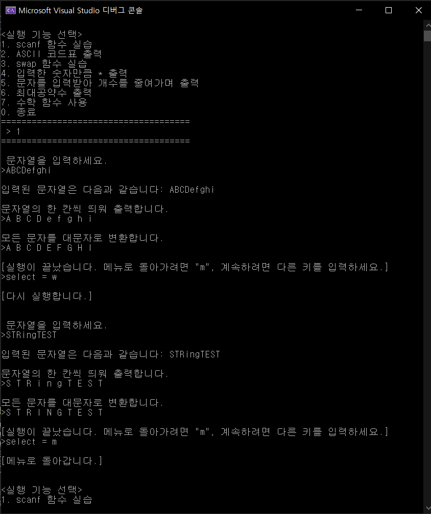 void work01() { while (1) { char string[100]; //입력받을 문자열 메모리공간 char blank[200]; //띄어쓰기 수행할 메모리공간 printf("\n 문자열을 입력하세요.\n>"); scanf("%s", &string); //문자열을 입력받아 string에 저장 printf("\n입력된 문자열은 다음과 같습니다: %s\n", string); int length; for (length = 0; length < sizeof(string); length++) //입력한 문자열의 길이 확인 { if (*(string + length) == NULL) break; } printf("\n문자열의 한 칸씩 띄워 출력합니다.\n"); for (int i = 0; i < length * 2; i++) { //띄어쓰기 포함 시 원래 문자열 길이의 두 배의 공간이 필요하므로 그에 해당하는 수만큼 반복실행 *(blank + i) = 32; //모든 요소에 빈 칸(아스키코드 32) 입력 if (i % 2 == 0) //짝수번째에는 글자 입력 { *(blank + i) = *(string + (i / 2)); } *(blank + i + 1) = NULL; //마지막 종료 반복 시 끝에 null을 붙여 끝점 지정 } printf(">%s", blank); printf("\n\n모든 문자를 대문자로 변환합니다.\n>"); for (int j = 0; j < length * 2; j += 2) { if (*(blank + j) > 96 && *(blank + j) < 123) { //입력된 문자가 소문자이면 *(blank + j) = *(blank + j) - 32; } } printf("%s", blank); if (cont() == 1) break; } } - 실행 화면