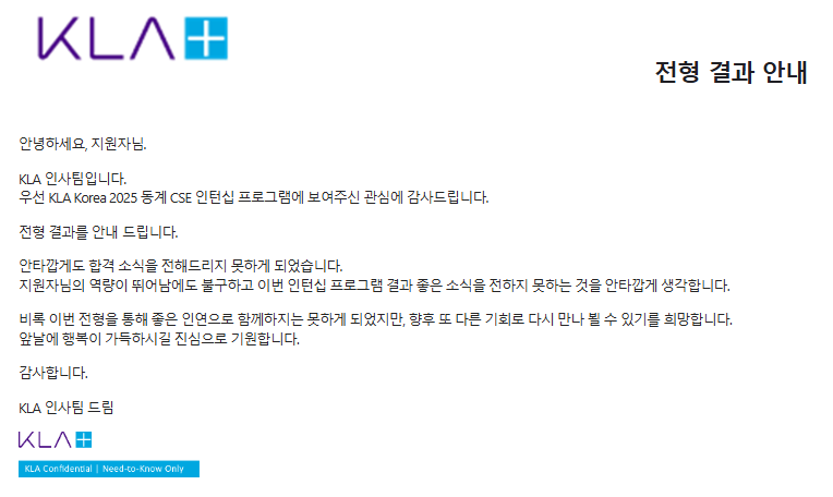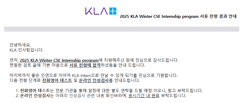 채용 마감 이후 4일 뒤 서류전형 합격자 발표 메일이 왔습니다. KLA는 채용 전형 합격자에게만 연락이 가고 정확한 발표일이 정해져있지 않기 때문에 일주일 뒤에야 탈락 소식을 알게 되시는 분들도 있었습니다. 전형 발표 여부 확인은 링커리어나 자소설닷컴 지원자 채팅방에서 다른 지원자분들을 통해 전달받을 수 있습니다.