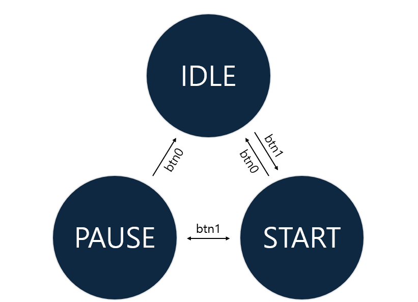 스탑워치 작동 시 start/stop 동작은 왼쪽 버튼(btn1)으로 전환되고, 오른쪽 버튼(btn0)을 누르면 동작이 멈추고 즉시 초기화하도록 설계했습니다. 이 동작을 FSM으로 구현하여 다음과 같이 설계했습니다.
