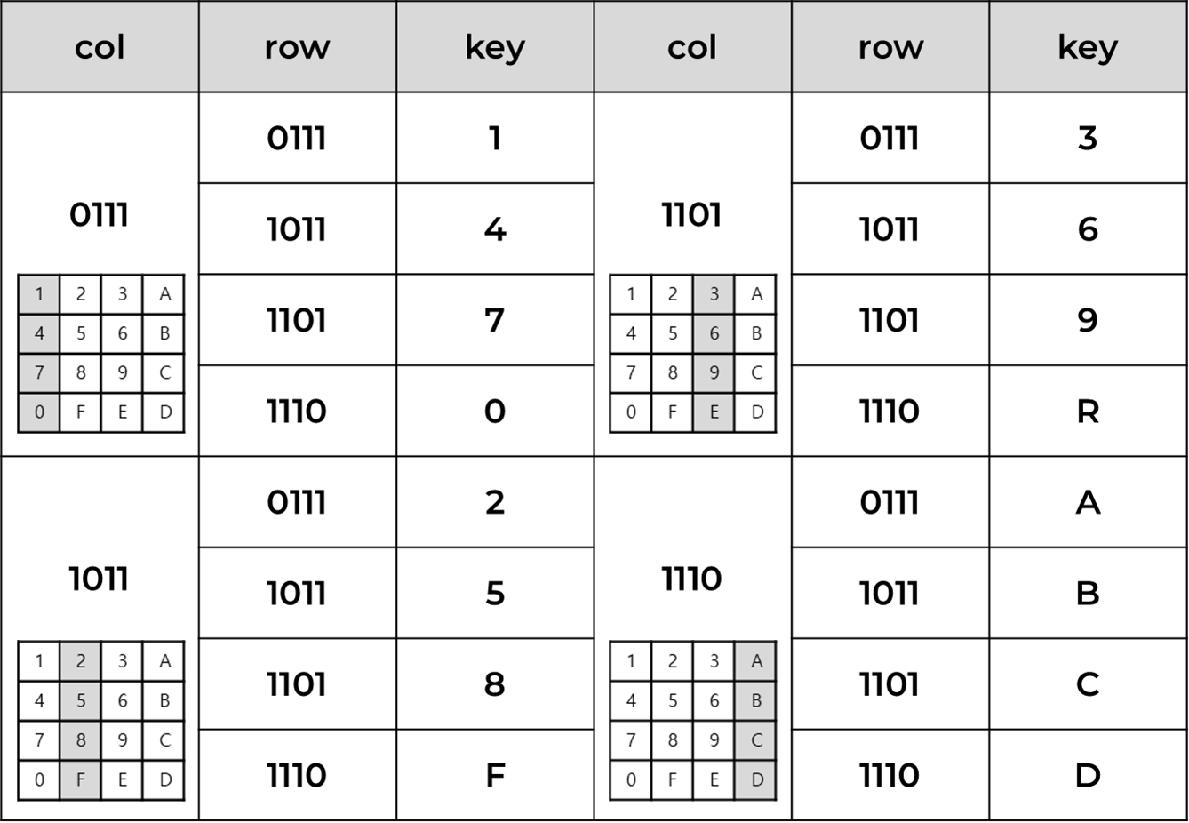 3. 13번을 누르면 COL1이 LOW, ROW4이 LOW가 되므로 COL이 0111일 때 ROW 입력은 1110이 됩니다.