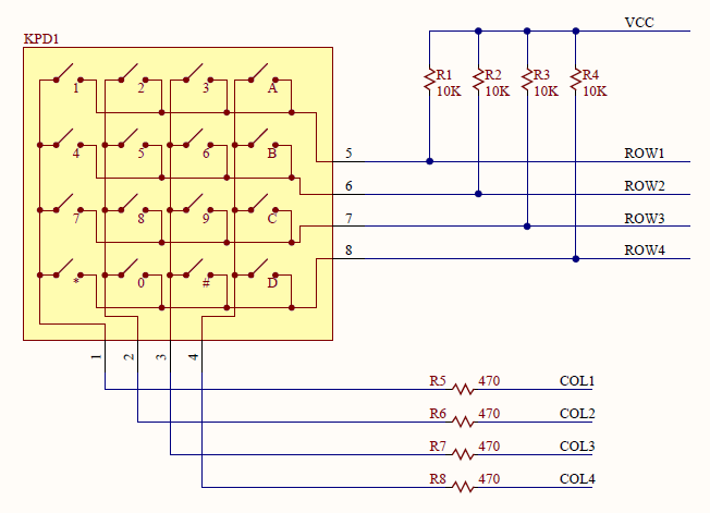 이후 LOW로 설정된 열에서 키가 눌린 경우, 이에 해당하는 행(ROW) 핀에 LOW 신호가 전달됩니다. 이 과정을 반복하여 각 열을 1ms마다 LOW로 설정한 뒤 ROW 값을 입력으로 확인하면 어떤 키가 눌렸는지 파악할 수 있습니다.