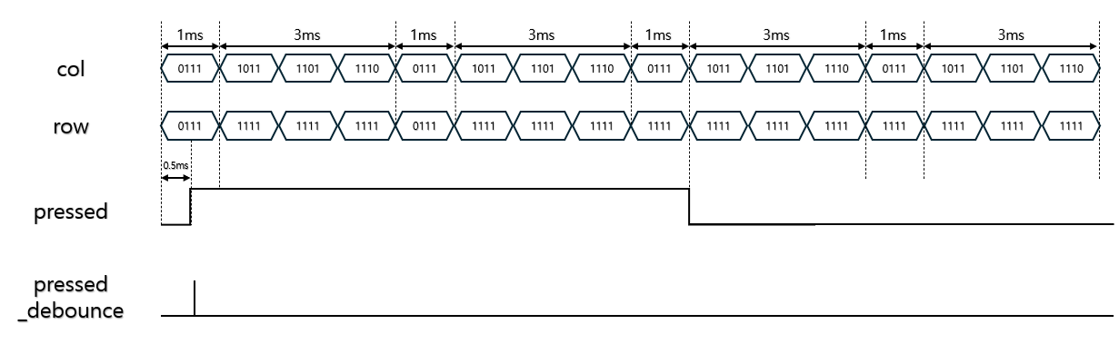 어떤 키를 누르고 있다면 위의 그림과 같이 row가 1111이 아닌(위에선 0111인) 시간이 1ms 지속됩니다. 따라서 row가 1111이 아닌 시간이 0.5ms 이상이면 pressed 신호가 HIGH가 되도록 설계했습니다.