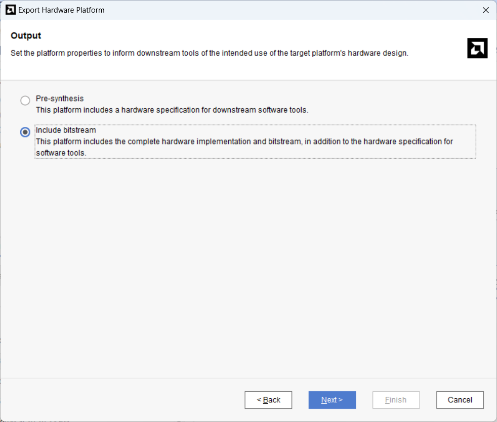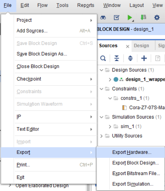 Bitstream 파일 생성이 완료되었으면 상단의 File 탭 - Export - Export Hardware 선택 후 Include Bitstream 옵션으로 XSA 파일을 내보냅니다.