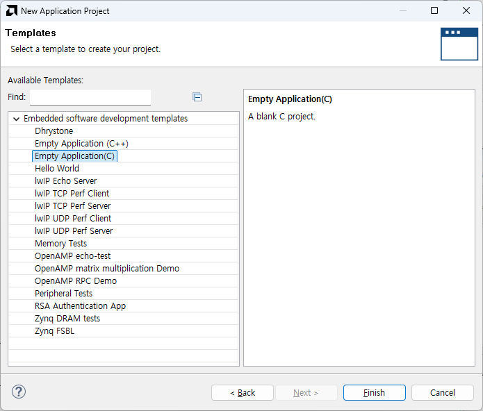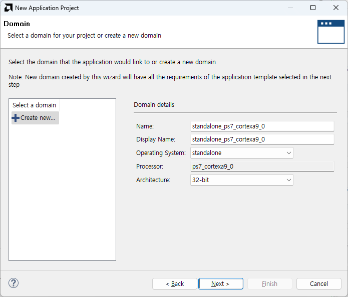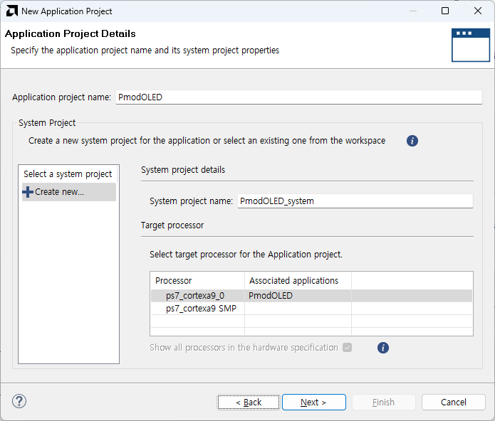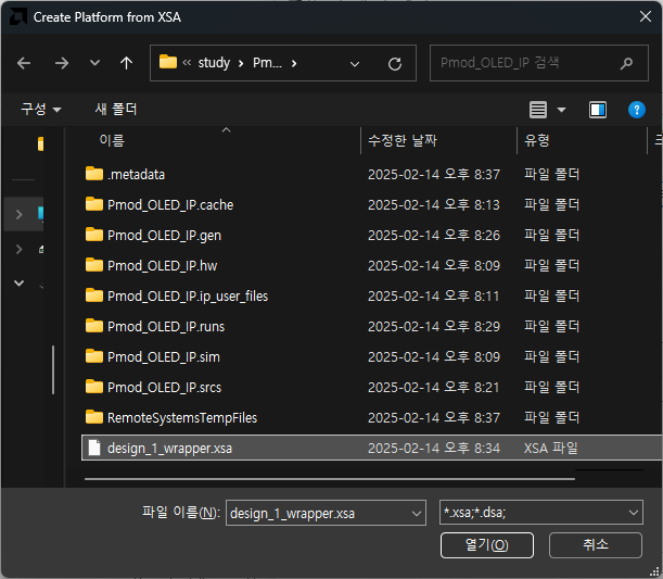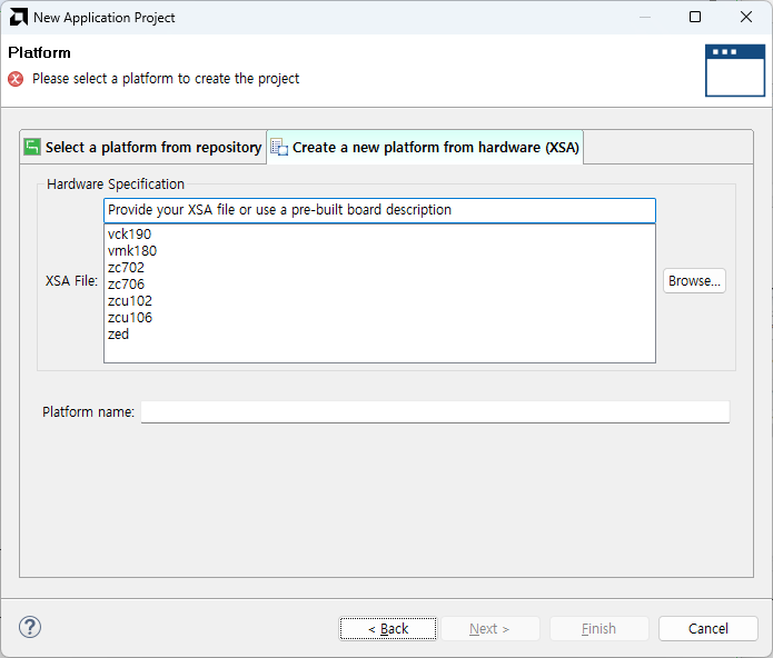 Create Application Project 선택 후 Next - 상단의 Create a new... 선택 후 Browse - 저장한 XSA 파일을 선택해줍니다.