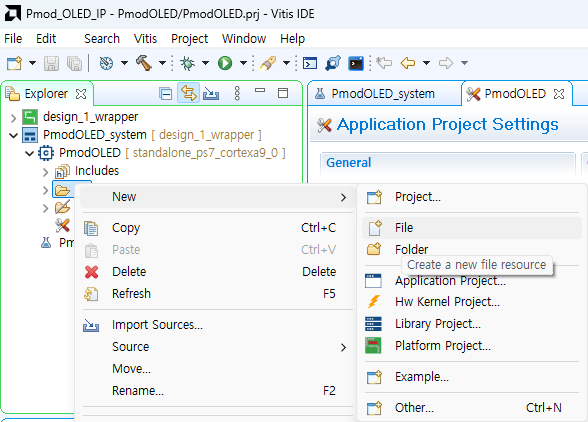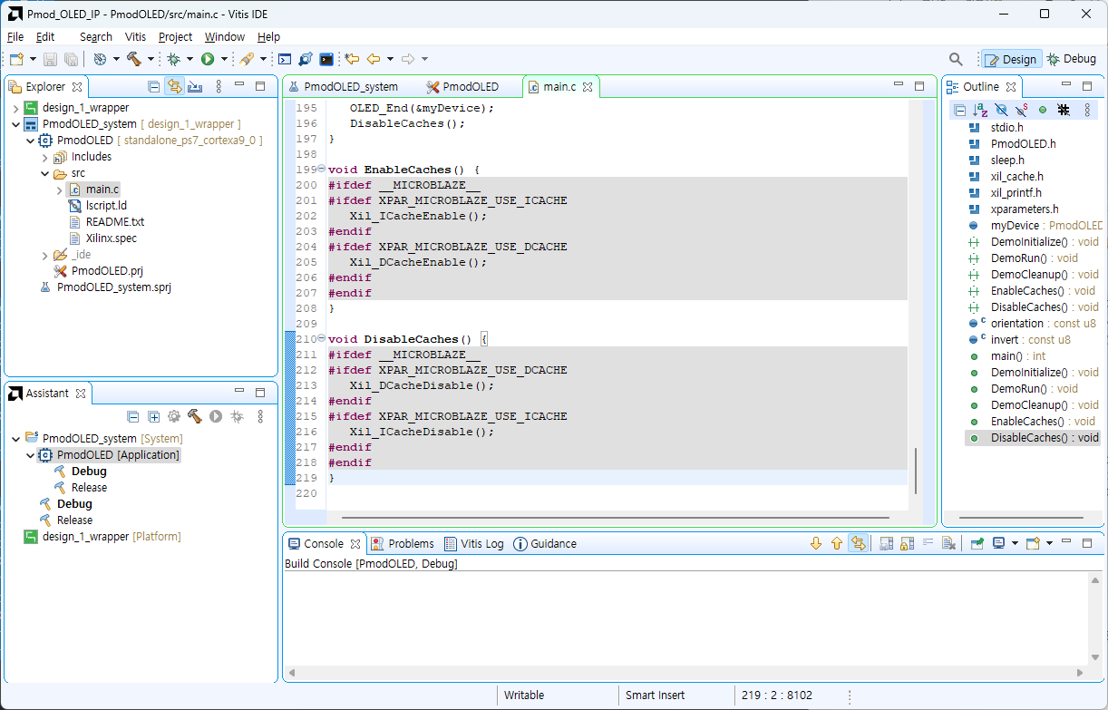 다운받았던 vivado library에서 PmodOLED 폴더를 찾아 main.c파일의 내용을 복사해서 vitis에 붙여넣기합니다.