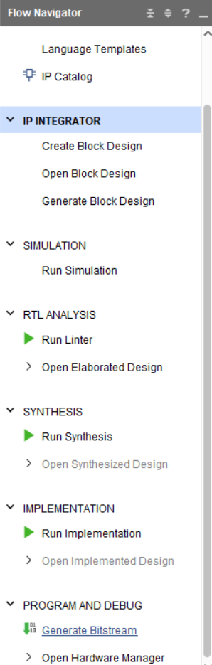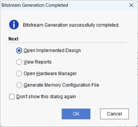 - "Open Hardware Manager" → Vivado의 하드웨어 매니저를 직접 실행하여 FPGA 보드에 하드웨어를 프로그래밍할 수 있습니다.