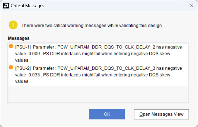 F6을 눌러 Validate Design을 수행합니다. 이 때 아래와 같이 PCW_UIPARAM_DDR_DQS_TO_CLK_DELAY 오류가 발생할 수 있으나 무시해도 됩니다. (대부분의 warnings와 일부 critical warnings는 무시 가능합니다.)