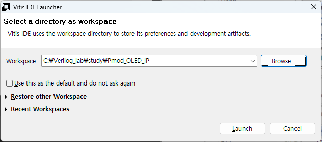 Vitis가 실행되면 Workspace를 설정하는데, 기존 vivado 프로젝트 폴더로 설정했습니다.