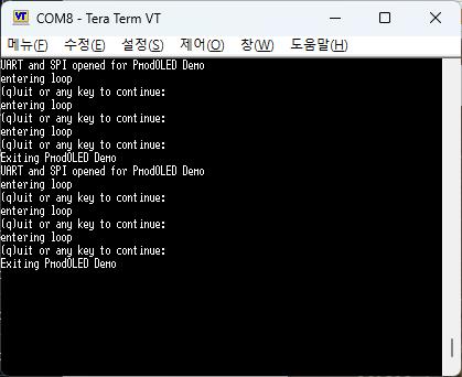 다음 두 개의 화면이 디스플레이되며, TeraTerm을 통해 다시 재생하거나 종료할 수 있습니다.