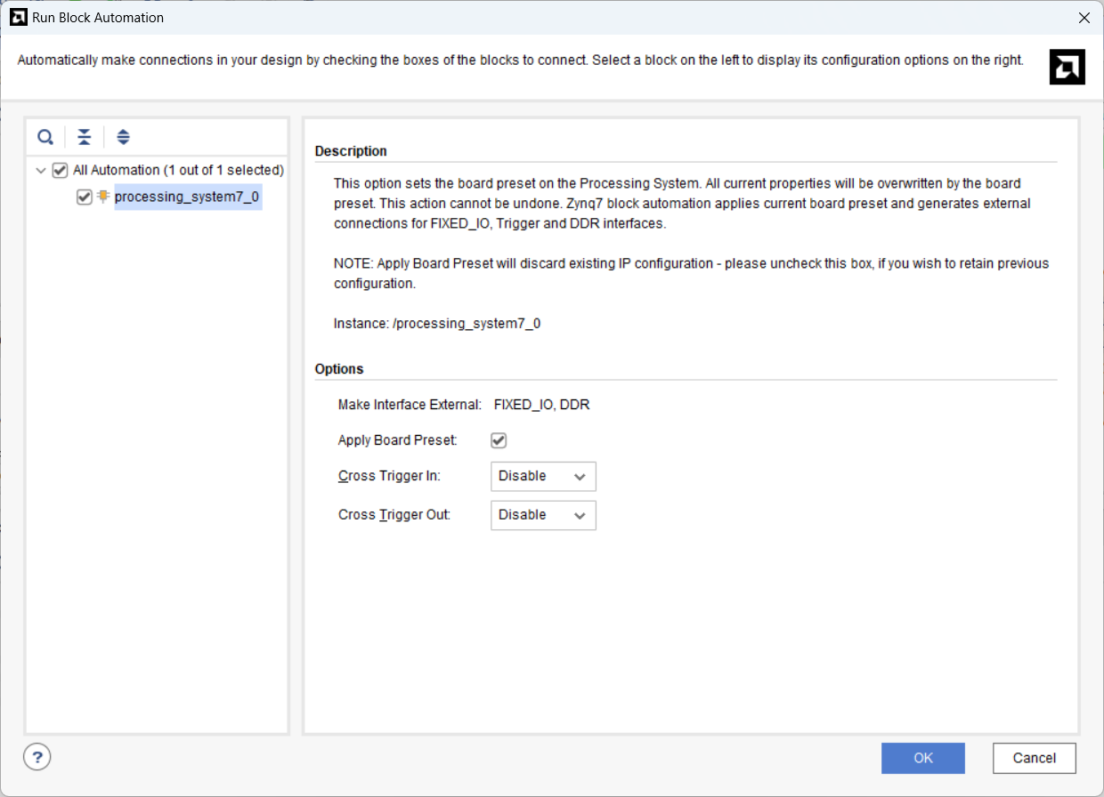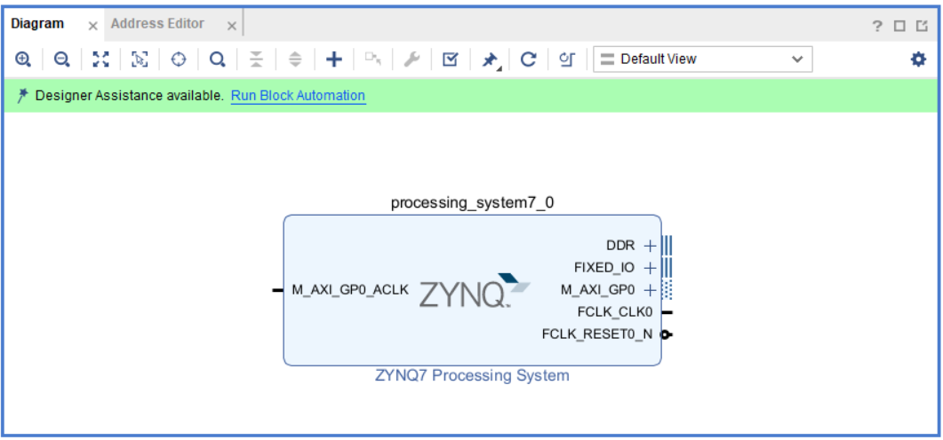Create Block Design 후 Add IP(Ctrl + I)로 Zynq7 Processing Sytem(PS) 추가 - Run Block Automation