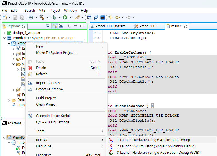 TeraTerm 설정이 완료되었으면 Vitis에서 Explorer 탭의 Application을 우클릭한 뒤 Run As - 1 Launch Hardware (Single Application Debug)를 선택합니다.