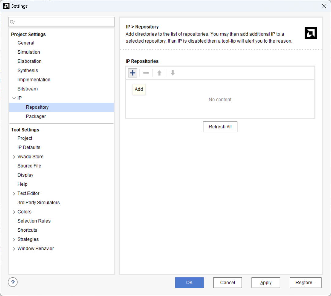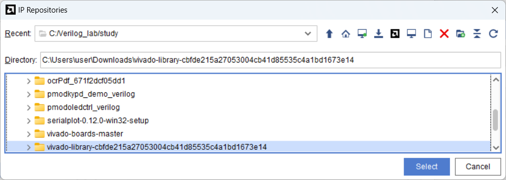 좌측 Project Manager 하단 Settings - IP - Repository에서 +버튼 클릭하여 vivado library 선택 - OK - OK