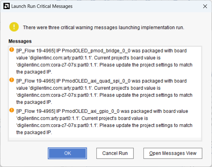- 다른 IP에 포함된 IP가 다른 보드 값(Board Value)과 함께 패키징되었다는 경고(Critical Warning)는 무시해도 됩니다.