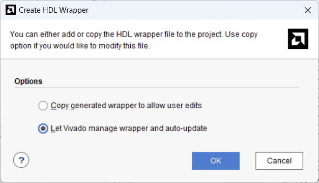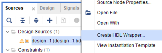 Sources 탭에서 Design Sources에 deseign_1.bd를 우클릭한 뒤 HDL Wrapper을 생성합니다.