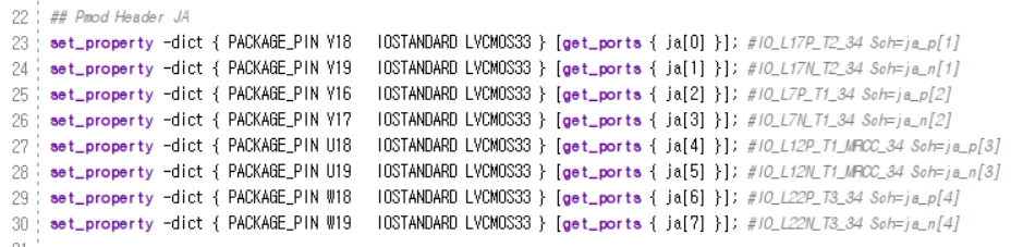 방금 추가한 xdc파일을 열어 사용할 JA포트의 주석처리를 제거합니다.