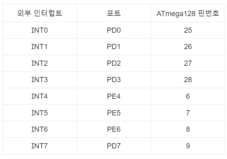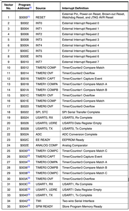- ATmega128의 인터럽트 벡터 테이블: 35개의 인터럽트에 대한 인터럽트 벡터 테이블(플래시 메모리의 0x0000~0x0045에 기록)