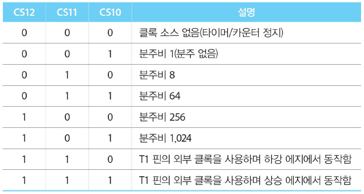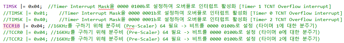 TCCR1B |= 0x04; //16KHz를 구하기 위해 분주비 (Pre-Scaler) 64 필요 -> 비트를 0000 0100b로 설정 (타이머 1에 대한 분주기가 256)