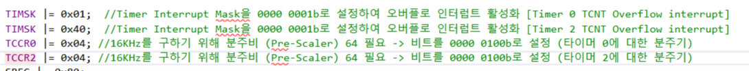 //TCCR0 |= 0x04; //16KHz를 구하기 위해 분주비 (Pre-Scaler) 64 필요 -> 비트를 0000 0100b로 설정 (타이머 0에 대한 분주기)