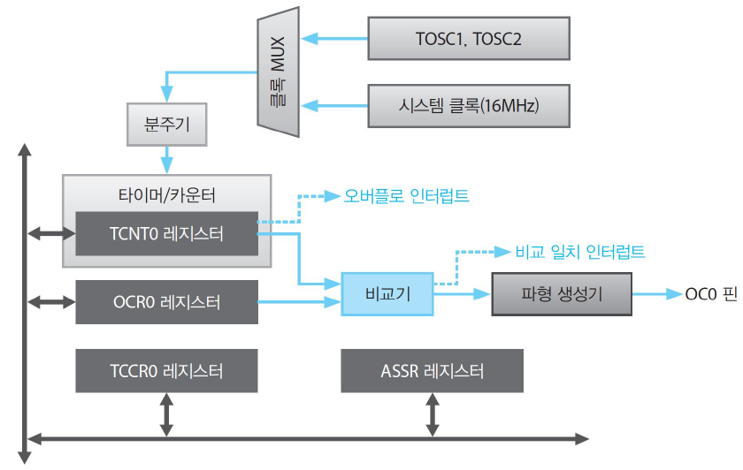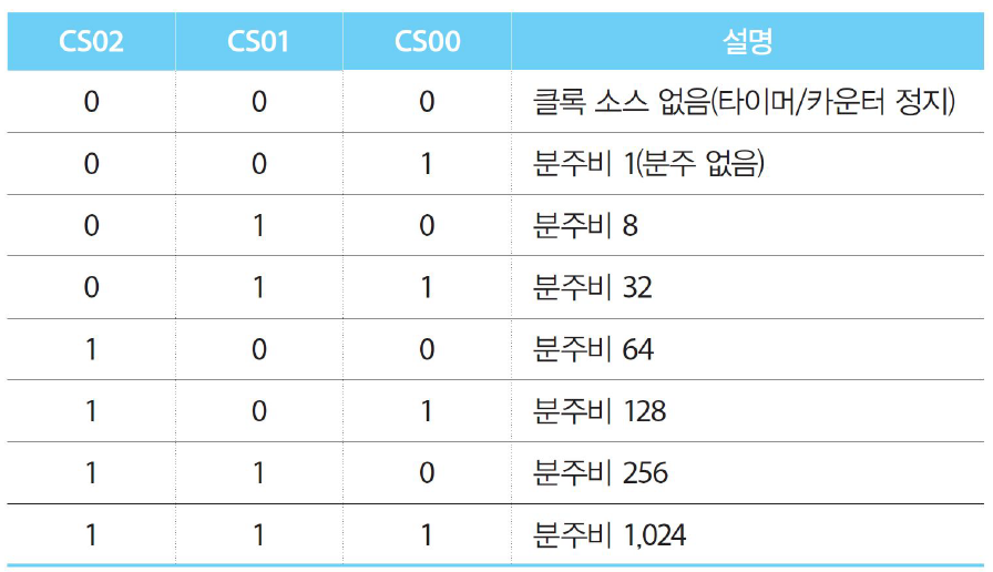 TCCR0 |= 0x04; //16KHz를 구하기 위해 분주비 64 필요 -> 비트를 0000 0100b로 설정