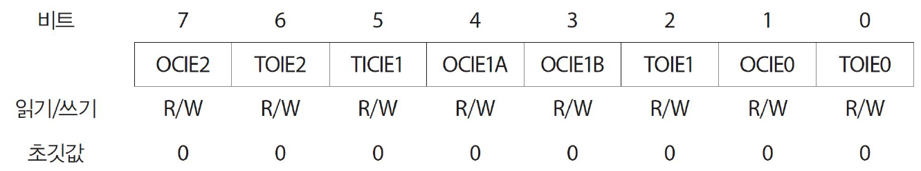 - TOIE0비트: 오버플로 인터럽트 활성화 비트(TcntOverflow)