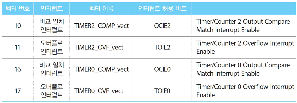 TIMSK |= 0x01; //Timer Interrupt Mask을 0000 0001b로 설정하여 오버플로 인터럽트 활성화 [Timer 0 TCNT Overflow interrupt]