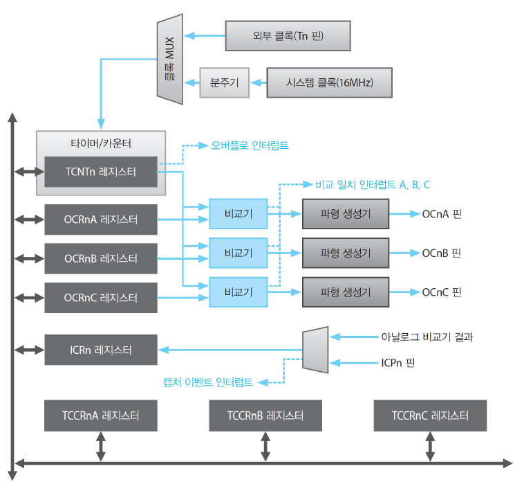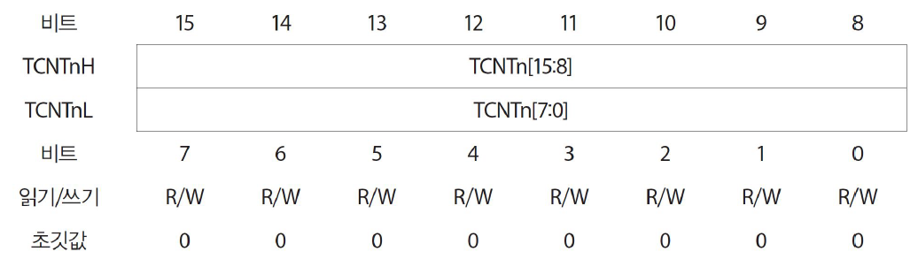 - TCNTn 레지스터 = TCNTnH + TCNTnL