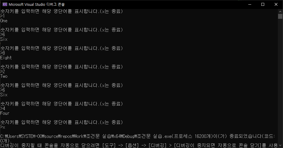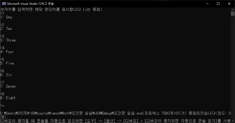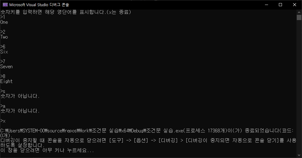 종료 조건문에 x | 0x20 == 'x'를 입력하면 입력 값을 소문자로 변환하여 종료 진행#include <stdio.h> #include <conio.h> int main(void) { printf("숫자키를 입력하면 해당 영단어를 표시합니다.(x는 종료)\n"); while (1) { printf(">"); char c = getch(); printf("%c\n", c); if (c == 'x' || c == 'X') break; switch (c) { case '1': printf("One\n"); break; case '2': printf("Two\n"); break; case '3': printf("Three\n"); break; case '4': printf("Four\n"); break; case '5': printf("Five\n"); break; case '6': printf("Six\n"); break; case '7': printf("Seven\n"); break; case '8': printf("Eight\n"); break; case '9': printf("Nine\n"); break; case '0': printf("Zero\n"); break; default: printf("숫자가 아닙니다.\n"); break; } printf("\n"); } }