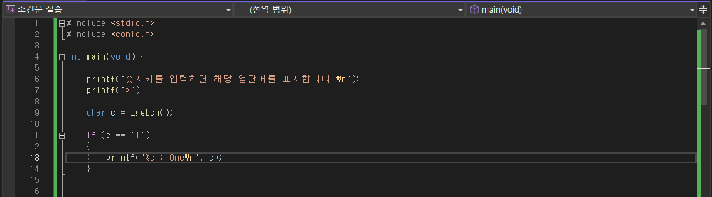 #include <stdio.h> #include <conio.h> int main(void) { printf("숫자키를 입력하면 해당 영단어를 표시합니다.\n"); printf(">"); char c = _getch(); if(c=='1'){ printf("One\n"); } }