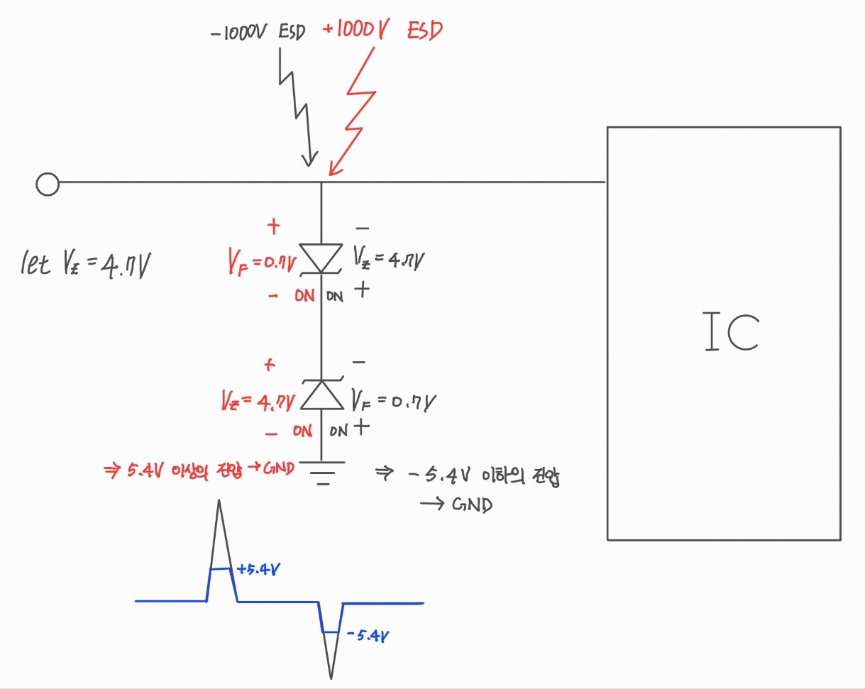Bi-Directional TVS 회로 및 전압 제한 - 위 그림에서 +전압의 ESD는 빨간색, -전압의 ESD는 검정색으로 표현