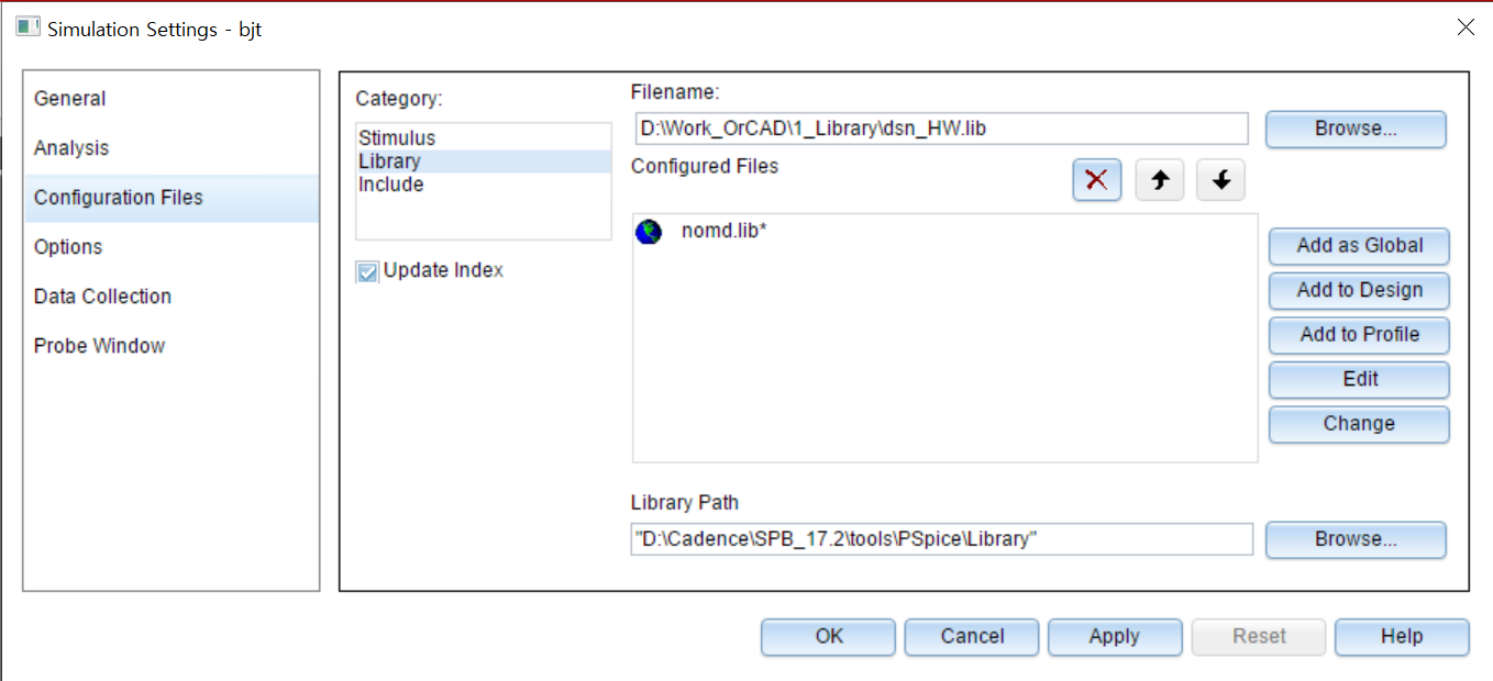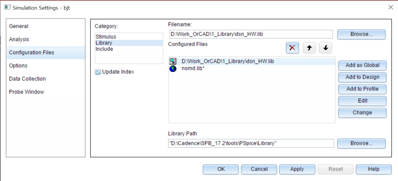 12. simulation프로파일 수정 - configuration files - category - library에 상단에서 만든 lib 추가를 위해 Browse 선택하여 찾기