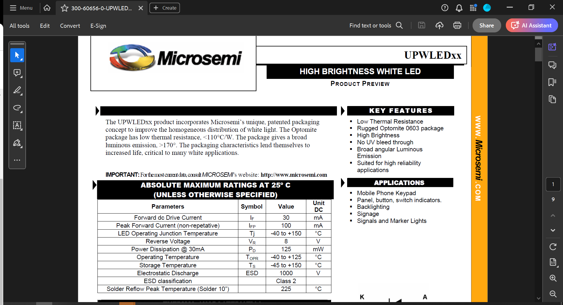 - 위 LED는 최소 20mA~50mA의 전류로 사용 가능(Forward Voltage) 항목에서 확인 --> IF=20mA~50mA