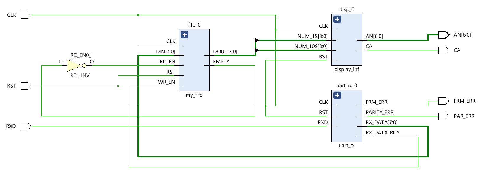 1. my_uart.xpr 프로젝트에 my_fifo.v를 Design Source로 추가한 뒤 uart_rx와 display_inf 사이에 모듈 추가
