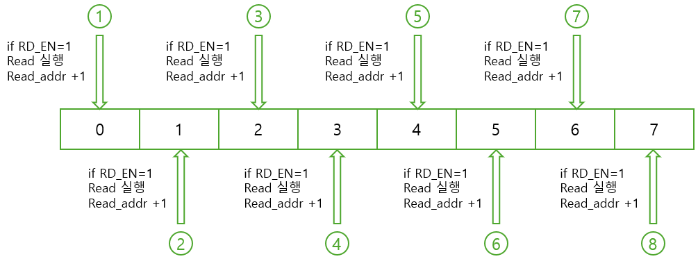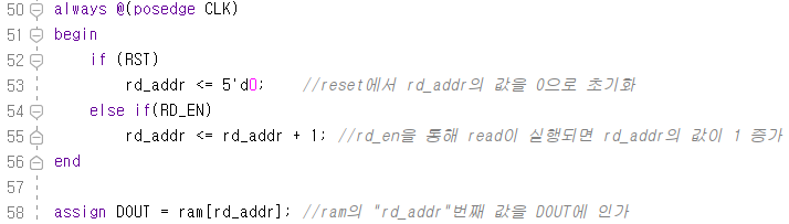 rd_addr <= rd_addr + 1; //rd_en을 통해 read이 실행되면 rd_addr의 값이 1 증가