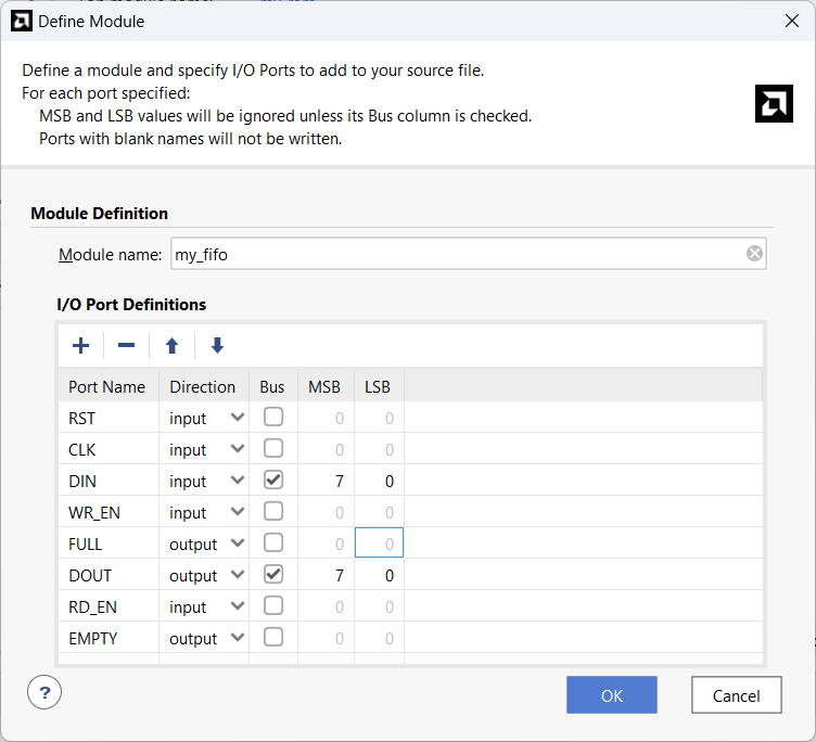 1. my_ram project를 열어 my_fifo.v로 design source 추가 후 포트 정의
