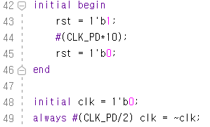 - clk은 초기값을 0으로 설정 후, 반주기마다 그 값을 반전하여 한 주기씩 clk이 켜졌다 꺼지도록 설정