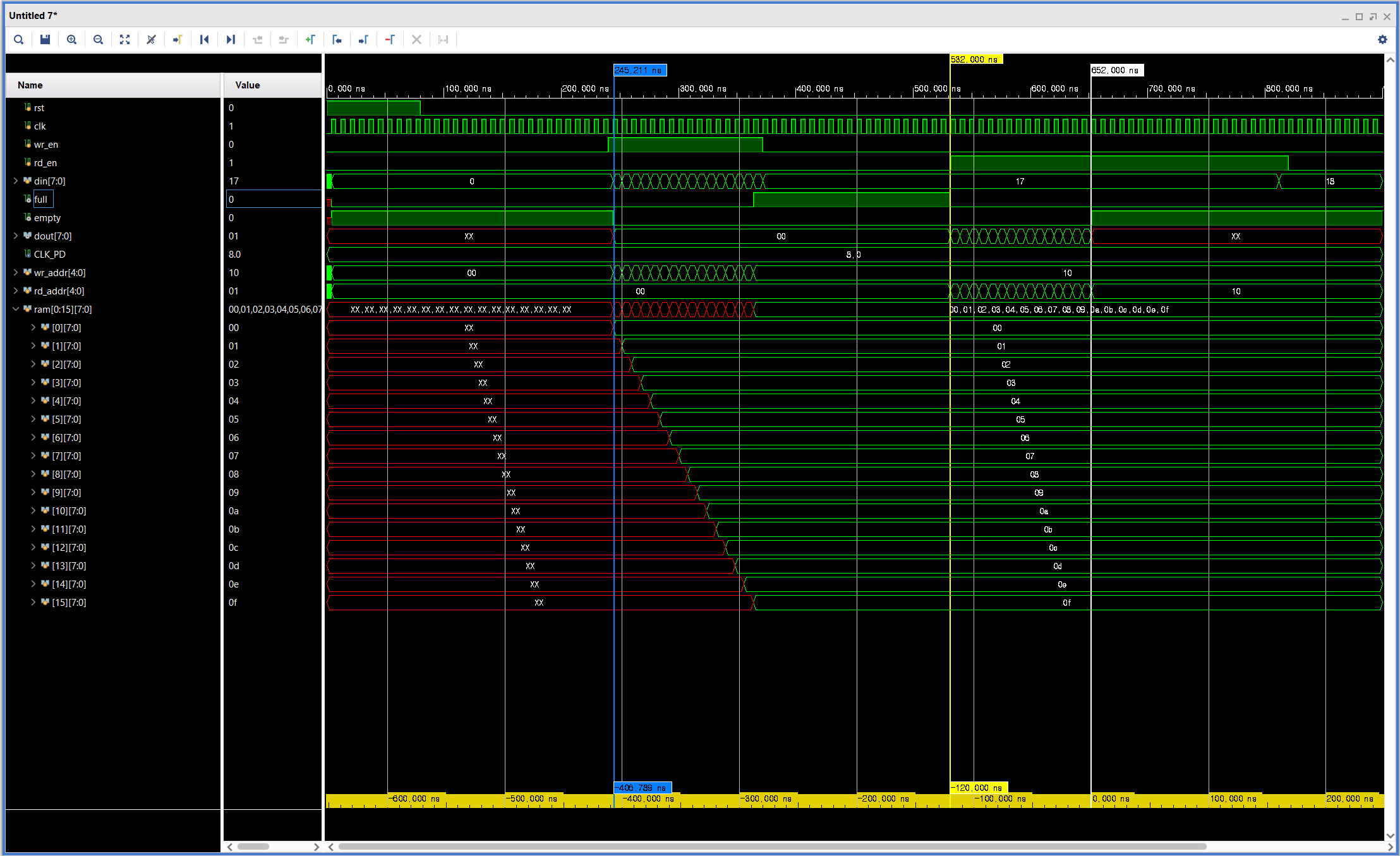 -> RAM에 Address가 1인 값을 읽으므로 그 때 처음 입력한 값 출력 - FIFO에 값이 저장되어 있다가 출력됨을 확인