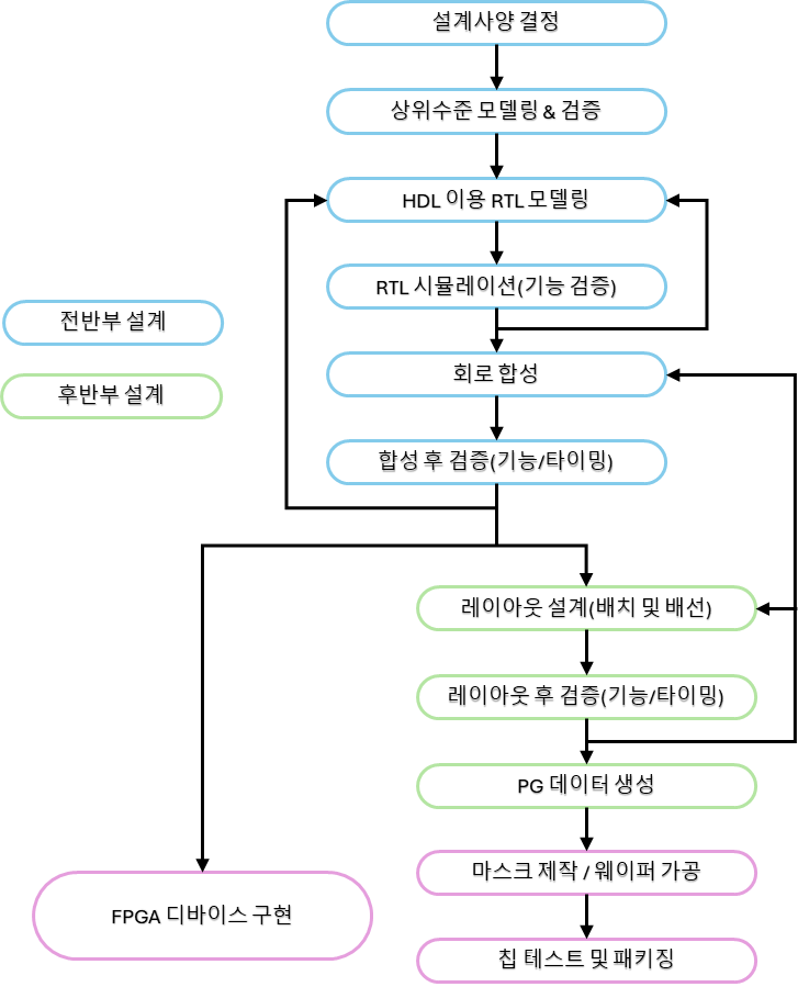 - 게이트 수준 타이밍 시뮬레이션, 레이아웃의 기생효과를 고려한 STA, 각종 설계규칙 검사 등을 통해 설계의 정확성 검증