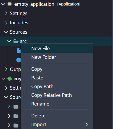 17. applicatino 우클릭 - New File로 테스트 프로그래밍 파일 test.c 만들어 코드 작성