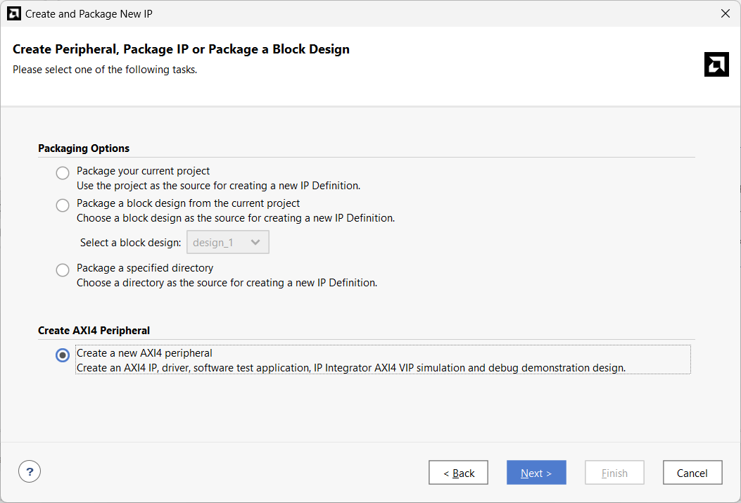 4. Tool에서 Create and package New IP 에서 Next - Create ZXI4 Peripheral - Create a new AXI4 peripheral 선택 후 next - 아래와 같이 설정 후 next - finish