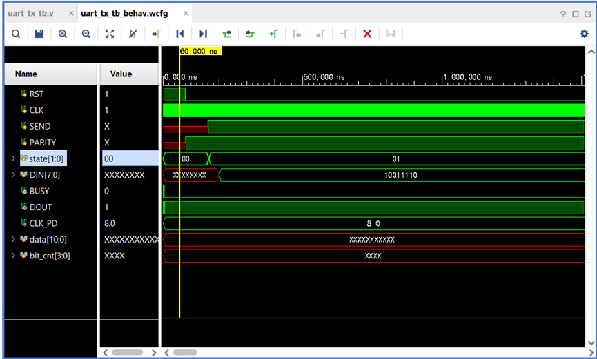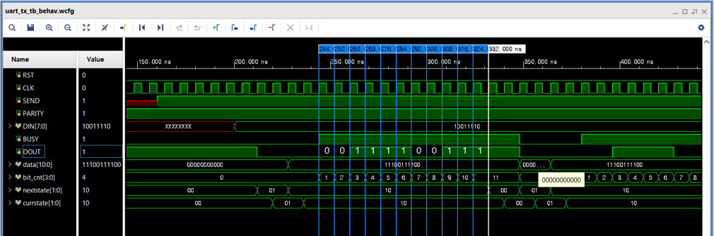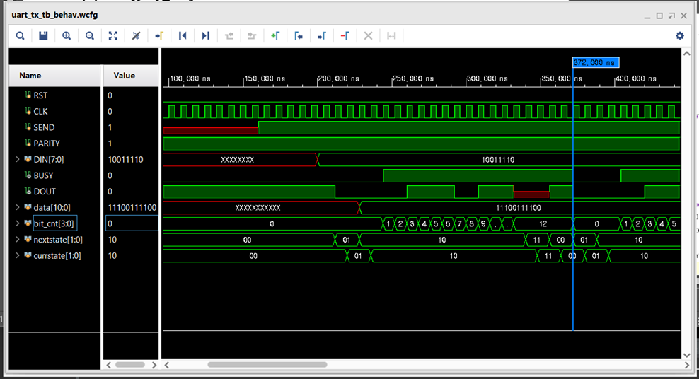 - 실행 결과: TX로부터 11비트의 데이터가 dout으로 baud rate에 맞추어 정상적으로 출력된다.