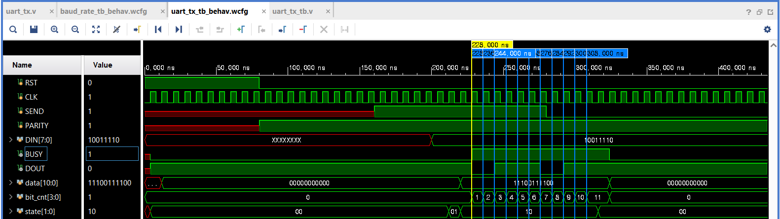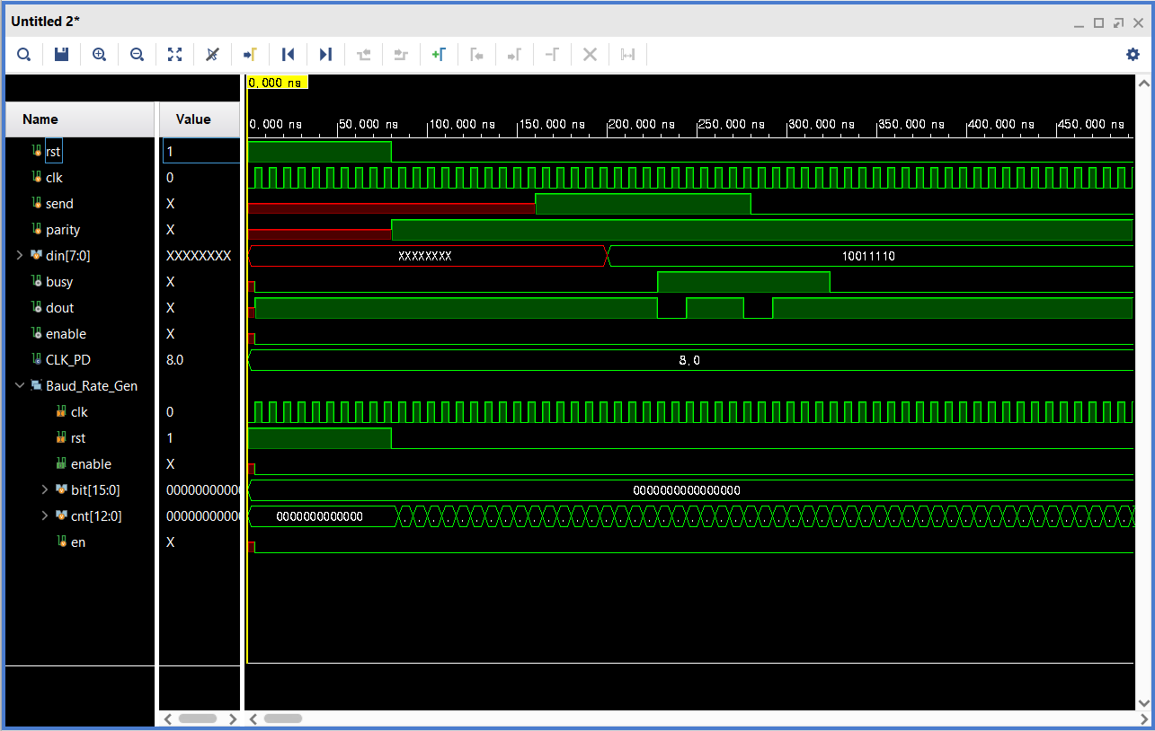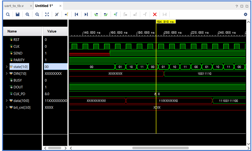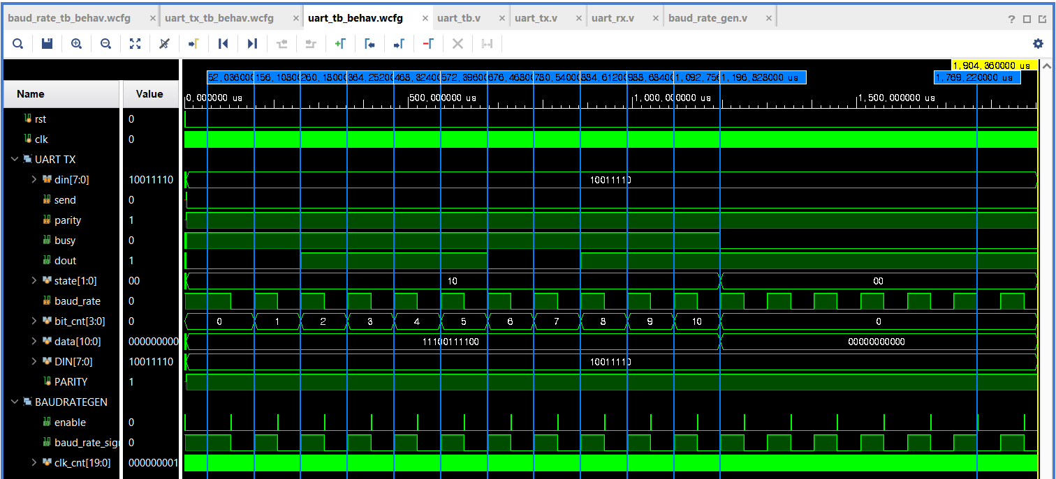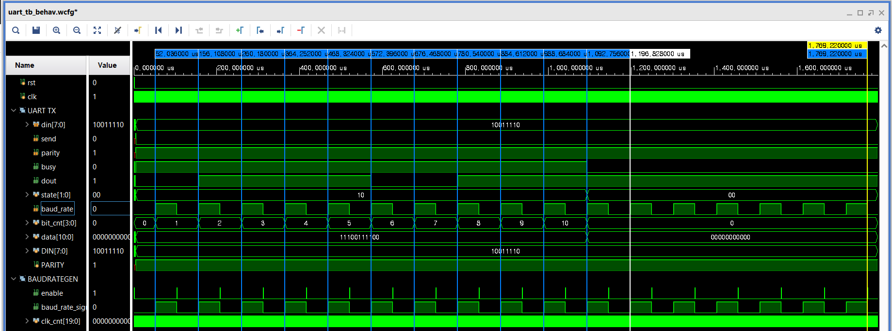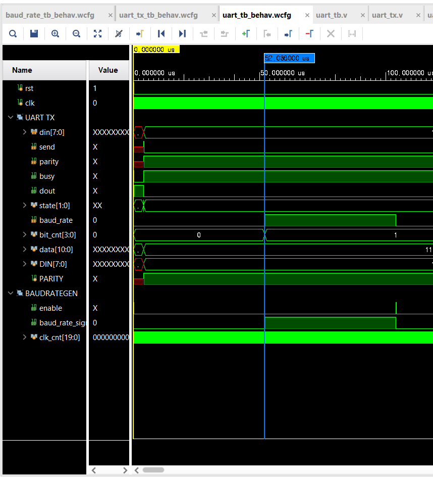 UART TX와 Baud Rate Generator을 함께 시뮬레이션하여 Enable 신호 확인