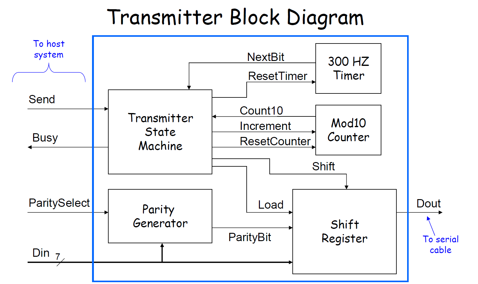 - send 신호가 들어오면 stop bit - parity bit - data - start bit 순으로 구성된 데이터 11비트를 dout으로 전송한다.