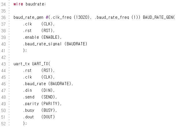 - top module에서 위 블록 다이어그램과 같이 Baud Rate Generator에서 UART TX로 Baud Rate 신호를 전달할 수 있도록 다음과 같이 input과 output을 변경하였다.
