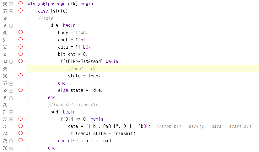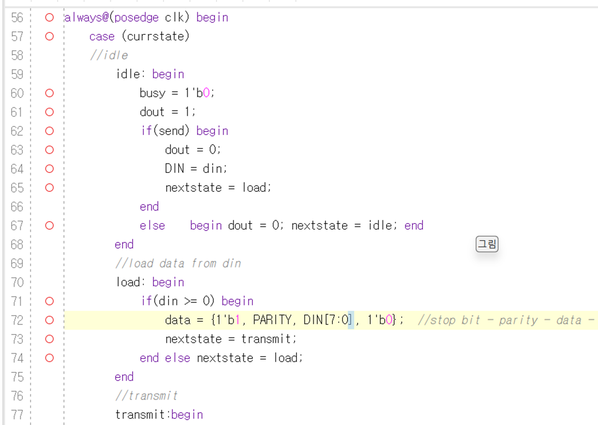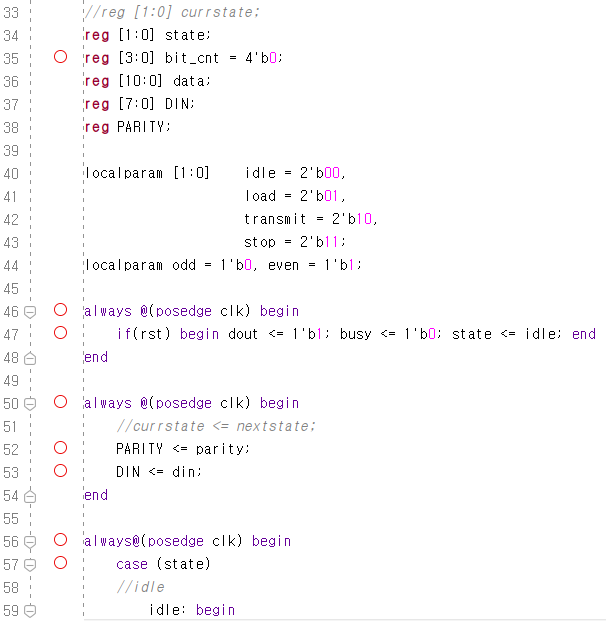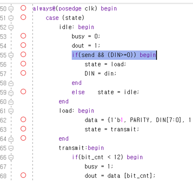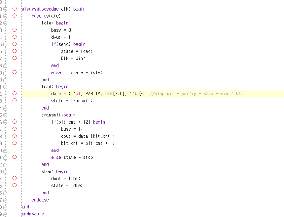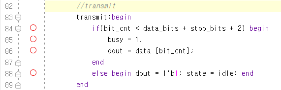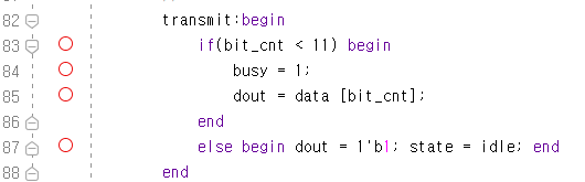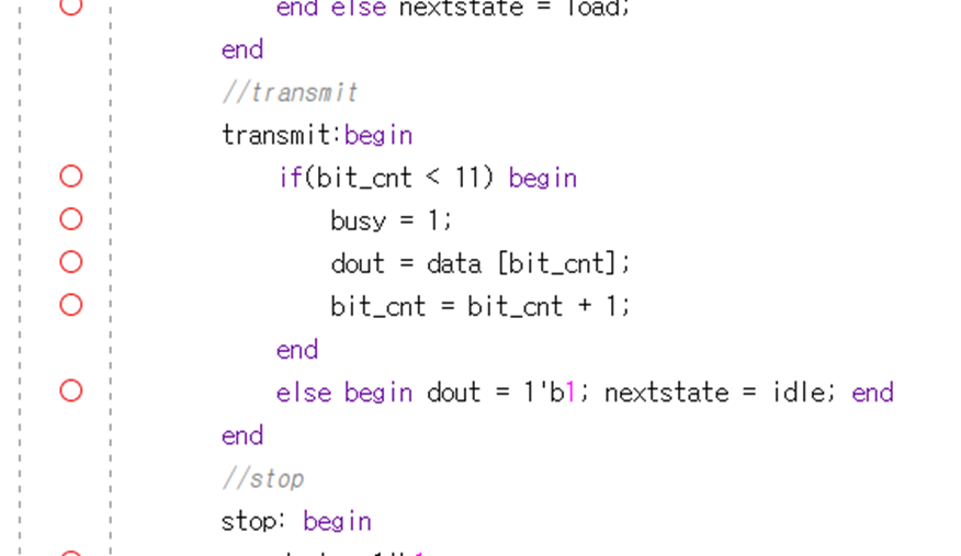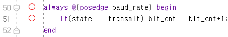 - bit_cnt 변수는 TX에서 Dout으로 데이터를 내보내는 transmit 상태에서만 증가한다. 이는 Baud Rate의 상승 에지에 맞춰 증가시키면 Baud Rate에 맞게 데이터를 전송할 수 있다.